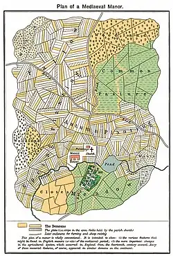 Plan d'un fief anglais (manor) hypothétique mais réaliste avec réserve (demesne), tenures (tenures) et biens communaux (common lands). Remarquer ici l'étendue des bénéfices ecclésiastiques (glebe).d'éventuels bénéfices ecclésiastiques.