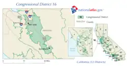 Depuis le redécoupage de 2020, le 16e district congressionnel de Californie est situé dans la région de la Baie de San Francisco. Il englobe la côte ouest et l'intérieur du Comté de San Mateo, ainsi que la frontière ouest du Comté de Santa Clara.