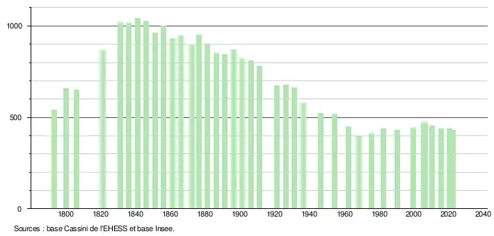 L'évolution du nombre d'habitants est connue à travers les recensements de la population effectués dans la commune depuis 1793. Pour les communes de moins de 10 000 habitants, une enquête de recensement portant sur toute la population est réalisée tous les cinq ans, les populations de référence des années intermédiaires étant quant à elles estimées par interpolation ou extrapolation[16]. Pour la commune, le premier recensement exhaustif entrant dans le cadre du nouveau dispositif a été réalisé en 2005[17].
