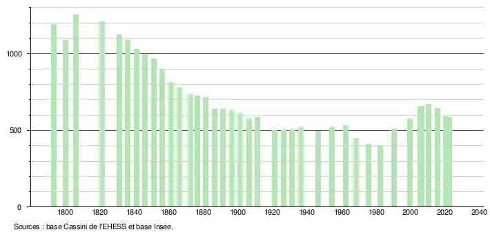 L'évolution du nombre d'habitants est connue à travers les recensements de la population effectués dans la commune depuis 1793. Pour les communes de moins de 10 000 habitants, une enquête de recensement portant sur toute la population est réalisée tous les cinq ans, les populations de référence des années intermédiaires étant quant à elles estimées par interpolation ou extrapolation[26]. Pour la commune, le premier recensement exhaustif entrant dans le cadre du nouveau dispositif a été réalisé en 2005[27].