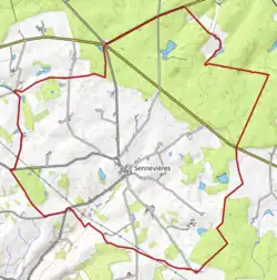 Ursus (Ours) de Cahors fonde vers 560 un monastère bénédictin à Sennevières[24] et Leobatius (Leubais) en est le premier abbé[2],[25]. Ce monastère, peut-être lié à une exploitation agricole[26] et qu'aucune source carolingienne ne mentionne, semble ainsi avoir eu une existence très brève[27]. Au Moyen Âge, Sennevières est une châtellenie dont Geoffroy de Sennevières est le premier seigneur connu en 1105. La fondation d'un centre paroissial aussi précoce et situé en bordure de forêt constitue une exception dans la région, où les paroisses sont prioritairement créées dans les vallées des cours d'eau[28]. Au XIVe siècle, la châtellenie passe entre les mains de la famille de Menou. En 1562, Sennevières est élevée au rang de baronnie. Le château qui domine le bourg et qui en 1770 comporte une fuie et une enceinte[29] tombe en ruines après la Révolution ; il n'en reste plus que quelques vestiges de murs[2]. Le dernier propriétaire de cette baronnie, en 1789, est François du Mouchet de Villedieu, évêque de Digne[30].