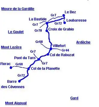 - ↑ « GR72 Randonnée du Col du Bez en Ardèche à Barre des Cévennes en Lozère », sur www.gr-infos.com (consulté le )
