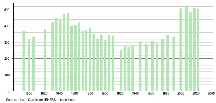 L'évolution du nombre d'habitants est connue à travers les recensements de la population effectués dans la commune depuis 1793. Pour les communes de moins de 10 000 habitants, une enquête de recensement portant sur toute la population est réalisée tous les cinq ans, les populations de référence des années intermédiaires étant quant à elles estimées par interpolation ou extrapolation[25]. Pour la commune, le premier recensement exhaustif entrant dans le cadre du nouveau dispositif a été réalisé en 2007[26].
