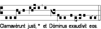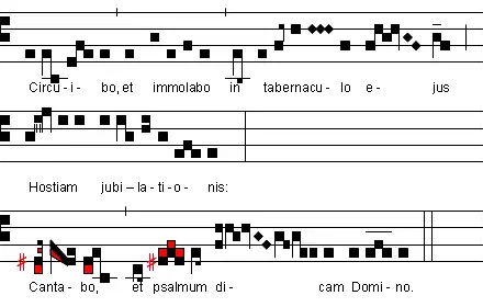 ♦ Le graduel Qui sedes, répertorié sous le septième mode, est très perturbé (que ce soit sur le plan mélodique ou modal). Dans le graduel vatican, des passages entiers sont effondrés d'une quinte par rapport à la version qu'en donne le graduel Dominicain.