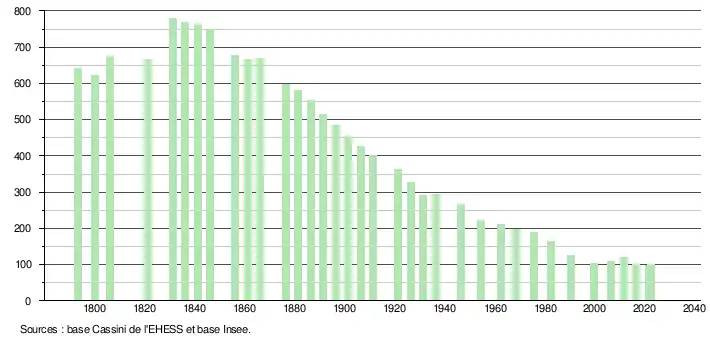 L'évolution du nombre d'habitants est connue à travers les recensements de la population effectués dans la commune depuis 1793. Pour les communes de moins de 10 000 habitants, une enquête de recensement portant sur toute la population est réalisée tous les cinq ans, les populations de référence des années intermédiaires étant quant à elles estimées par interpolation ou extrapolation[17]. Pour la commune, le premier recensement exhaustif entrant dans le cadre du nouveau dispositif a été réalisé en 2006[18].
