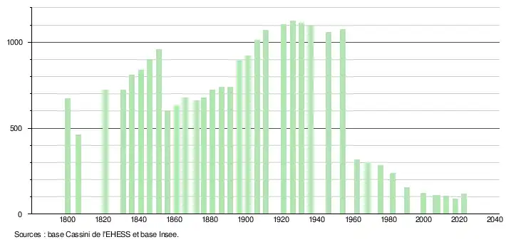 L'évolution du nombre d'habitants est connue à travers les recensements de la population effectués dans la commune depuis 1800. Pour les communes de moins de 10 000 habitants, une enquête de recensement portant sur toute la population est réalisée tous les cinq ans, les populations de référence des années intermédiaires étant quant à elles estimées par interpolation ou extrapolation[6]. Pour la commune, le premier recensement exhaustif entrant dans le cadre du nouveau dispositif a été réalisé en 2007[7].