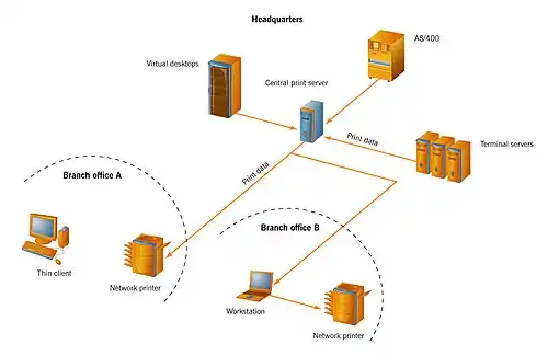 - d'une ou plusieurs connexions à des imprimantes. La plupart des serveurs d'impression disposent de connexions USB ; certains disposent également de ports parallèles. Certains serveurs d'impressions ne sont pas connectés directement par leur câble d'interface aux imprimantes. Ces dernières sont connectées via le réseau, en effet, les imprimantes professionnelles sont généralement connectées directement sur le réseau pour permettre une répartition au sein des locaux de l'entreprise.