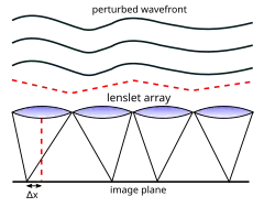 Un Shack-Hartmann est composé d'une matrice de micro-lentilles, placée devant un capteur sensible à la lumière (le plus souvent une caméra CCD). Ces deux composants sont situés dans des plans parallèles[2]. À l'arrivée d'un faisceau, chaque micro-lentille génère sur le capteur un point de focalisation, dont la position varie, en fonction de la déformation locale du front d'onde, autour de sa position de référence, correspondant à un front d'onde non déformé. L'image donnée par le capteur est ainsi une matrice de taches dont le nombre correspond au nombre de micro-lentilles. La déviation de chaque tache par rapport à sa référence donnant la pente (ou dérivée) locale du front d'onde, l'ensemble des déviations donne directement le gradient du front d'onde. Des algorithmes permettent alors de remonter au front d'onde. Si un front d'onde est plan ou sphérique (c’est-à-dire issu d'une source lumineuse ponctuelle), les micro-lentilles génèrent une matrice de taches dont l'espacement est parfaitement régulier. Cet espacement est directement relié à la courbure du front d'onde (qui est directement reliée à la distance de la source) : plus celui-ci est courbé, plus les taches seront espacées. Le capteur permet d'effectuer la mesure de front d'onde en temps réel. Celui-ci étant relié à un ordinateur, un programme informatique recherche sur l'image la position des taches, calcule leur déviation par rapport à leur tache de référence respective, puis remonte au front d'onde.