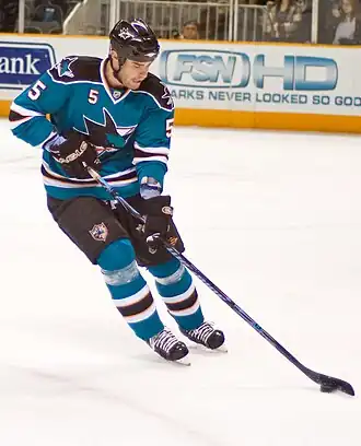 Lors des trente premiers matchs de la saison, les Sharks réalisent vingt-cinq victoires pour devenir la meilleure équipe de la LNH sur les trente premiers matchs en égalisent les Bruins de Boston en 1929-1930[58]. Les Sharks terminent la saison régulière avec cinquante-trois victoires pour seize défaites et onze défaites en prolongation ; ils remportent pour la première fois de leur histoire le Trophée des présidents en étant classés au premier rang du classement général[59]. Lors des séries, les Sharks rencontrent les Ducks d'Anaheim qui les surprennent en les éliminant en six parties avec deux blanchissages du gardien d'Anaheim, Jonas Hiller[60]. Les Ducks sont la troisième équipe depuis 2000 à éliminer un vainqueur du Trophée des présidents au premier tour — c'est le cas des Sharks en 2000 qui éliminent les Blues de Saint-Louis[61].