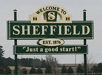 - (en) Cet article est partiellement ou en totalité issu de l’article de Wikipédia en anglais intitulé « Sheffield, Iowa » (voir la liste des auteurs).