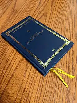 Shehimo ( syriaque : ܫܚܝܡܐ , malayalam : ഷഹീമോ ; anglais : Book of Common Prayer, également orthographié Sh'himo ) est le bréviaire chrétien syriaque occidental de l' Église syriaque orthodoxe et des chrétiens syriaques occidentaux de Saint-Thomas d'Inde ( Église catholique syro-malankare , Église syrienne jacobite malankare , Église syrienne orthodoxe malankare , Église syrienne Mar Thoma et Église Thozhiyur ) qui contient les sept heures canoniques de prière[1],[2]. Le Shehimo comprend des lectures bibliques, des hymnes et d'autres prières prescrites du système liturgique syriaque occidental. Dans le bréviaire, certaines prières sont récitées à sept heures de prière fixes , face à l'est à la maison ou à l'église. Le Shehimo propose également des prières communautaires en guise d'introduction au Saint Qurbono . La pratique de la prière pendant les heures canoniques trouve son origine dans le Psaume 119:164 , dans lequel le prophète David prie Dieu sept fois par jour[3],[4]. Le bréviaire Shehimo peut être prié soit en lisant, soit en psalmodiant la prose, soit en chantant les versets. Les différentes versions du bréviaire sont disponibles en syriaque , en malayalam et en anglais , entre autres langues[5].