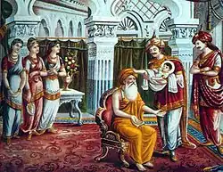 À la naissance du jeune Gautama, les devins auraient prédit à son père qu’il serait soit un souverain universel, soit un bouddha. Optant pour le premier choix, il tenta d'empêcher son fils de se tourner vers une vie religieuse en lui fournissant plaisirs et richesses à profusion et en lui interdisant de sortir du palais royal.