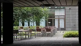 L'entrée principale et la façade sont visibles depuis Mannerheimintie. De l'autre côté, l'édifice semble absorber le parc d'écrivain en direction de Lastenlinna. Au troisième angle se trouve une tour construite à partir d'une cheminée.