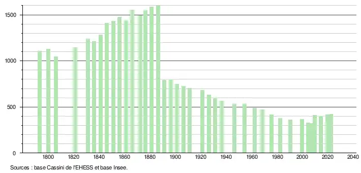 L'évolution du nombre d'habitants est connue à travers les recensements de la population effectués dans la commune depuis 1793. Pour les communes de moins de 10 000 habitants, une enquête de recensement portant sur toute la population est réalisée tous les cinq ans, les populations de référence des années intermédiaires étant quant à elles estimées par interpolation ou extrapolation[16]. Pour la commune, le premier recensement exhaustif entrant dans le cadre du nouveau dispositif a été réalisé en 2004[17].
