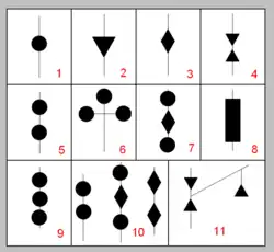 Ces signaux consistent en un ensemble de formes géométriques simples — boule, cylindre, cône et losange — qui sont affichées, suspendues à un mât, d'une manière prescrite pour indiquer l'état opérationnel d'un navire ; certains de ces signaux peuvent être quelque peu complexes[1].