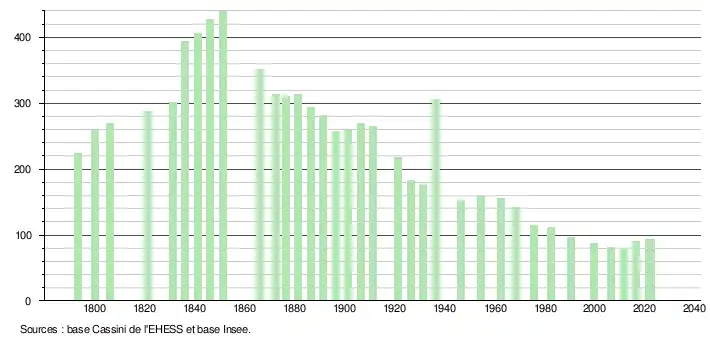 L'évolution du nombre d'habitants est connue à travers les recensements de la population effectués dans la commune depuis 1793. Pour les communes de moins de 10 000 habitants, une enquête de recensement portant sur toute la population est réalisée tous les cinq ans, les populations de référence des années intermédiaires étant quant à elles estimées par interpolation ou extrapolation[17]. Pour la commune, le premier recensement exhaustif entrant dans le cadre du nouveau dispositif a été réalisé en 2006[18].