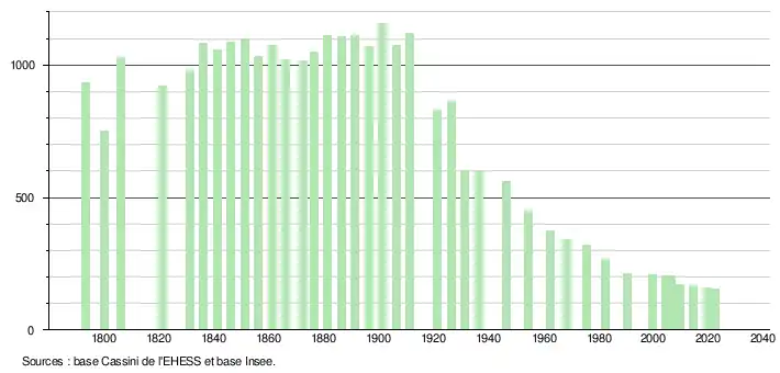 L'évolution du nombre d'habitants est connue à travers les recensements de la population effectués dans la commune depuis 1793. Pour les communes de moins de 10 000 habitants, une enquête de recensement portant sur toute la population est réalisée tous les cinq ans, les populations de référence des années intermédiaires étant quant à elles estimées par interpolation ou extrapolation[22]. Pour la commune, le premier recensement exhaustif entrant dans le cadre du nouveau dispositif a été réalisé en 2004[23].