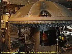- La cloche, d'un poids de 2 tonnes, elle est intercalée entre les directrices et la roue afin d'augmenter (manœuvre vers le haut) ou de diminuer (manœuvre vers le bas) l'entrée de l'eau donc, de modifier la puissance de la turbine.