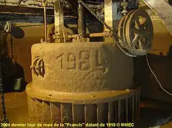 - La roue à aubes, d'un diamètre de 2 500 mm, c'est la plus grosse turbine installée à l'époque dans la vallée de la haute Seine, elle pouvait avaler un débit de 40 m3/s et fonctionner sous 1,70 m de chute, sa puissance était de 118 kW.