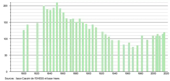 L'évolution du nombre d'habitants est connue à travers les recensements de la population effectués dans la commune depuis 1800. Pour les communes de moins de 10 000 habitants, une enquête de recensement portant sur toute la population est réalisée tous les cinq ans, les populations de référence des années intermédiaires étant quant à elles estimées par interpolation ou extrapolation[6]. Pour la commune, le premier recensement exhaustif entrant dans le cadre du nouveau dispositif a été réalisé en 2004[7].