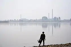 Vue aérienne du centre-ville de Sinŭiju, depuis la Chine. | |||