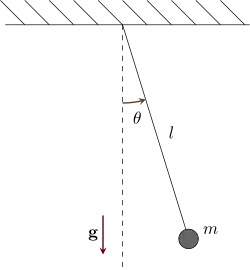 On considère un pendule simple, de longueur l, oscillant dans un champ de pesanteur g. Soit θ l'angle qu'il forme avec la verticale descendante, et θ0 son amplitude maximale. θ vérifie l'équation du mouvement suivante (provenant de la conservation de l'énergie mécanique du pendule) :
