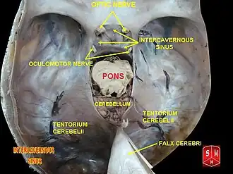 Le sinus intercaverneux postérieur (ou sinus coronaire postérieur) passe derrière la selle turcique. Il sus-jacent à l'hypophyse.