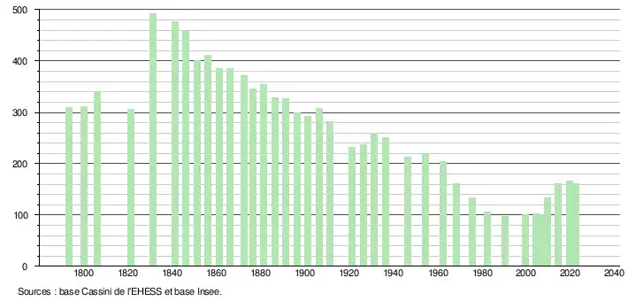 L'évolution du nombre d'habitants est connue à travers les recensements de la population effectués dans la commune depuis 1793. Pour les communes de moins de 10 000 habitants, une enquête de recensement portant sur toute la population est réalisée tous les cinq ans, les populations de référence des années intermédiaires étant quant à elles estimées par interpolation ou extrapolation[24]. Pour la commune, le premier recensement exhaustif entrant dans le cadre du nouveau dispositif a été réalisé en 2004[25].