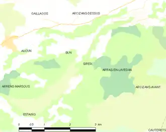 Les communes les plus proches[Note 1] sont[3] : Bun (0,8 km), Arcizans-Dessus (1,4 km), Gaillagos (2,4 km), Arras-en-Lavedan (2,5 km), Arcizans-Avant (3,6 km), Aucun (3,7 km), Saint-Savin (4,6 km), Estaing (5,0 km).