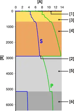 A : Vitesse (km s−1). B : profondeur (km). 1 : croûte. 2 : interface noyau-manteau. 3 : manteau supérieur. 4 : manteau inférieur. 5 : noyau externe. 6 : noyau interne.