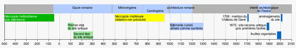 Les fouilles d'État, entreprises en 1976 par Claude Lambert et Jean Rioufreyt, et poursuivies jusqu'en 2006, permirent de mettre au jour la nécropole halstattienne, un théâtre antique de trois mille places, un bâtiment peut-être à double vocation (forum et macellum), deux temples, dont l'un assez semblable extérieurement à la Maison carrée de Nîmes, des thermes romains, et enfin un aqueduc alimentant l'ensemble du site. D'autres bâtiments, dont la fonction n'est pas connue, sont localisés mais restent à étudier.