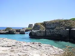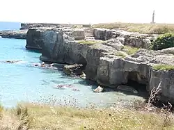 la Grotta della Poesia est une grotte elliptique dans laquelle l'activité humaine est documentée depuis le néolithique[4]. Son nom, dérivé du grec médiéval Πόσις, fait référence à une source d'eau potable disparu depuis. De nos jours, l’entrée et certaines parties de la grotte sont sous l’eau, mais étaient sèches par le passé. En outre, le toit de la grotte s’est effondré après l’Antiquité. La grotte a été utilisée à des fins cultuelles pendant une très longue période, comme en témoignent de nombreuses peintures rupestres et graffitis. Les traces les plus anciennes, mais aussi les moins bien conservées, proviennent du néolithique et montrent des motifs de mains, de pieds, humains, animaux ou dessins abstraits. Des parallèles étroits peuvent être trouvés dans la Grotta dei Cervi (Otranto) (it), à environ 25 km. En outre, de nombreuses inscriptions et graffitis datant du IVe à la fin du IIe siècle av. J.-C. ont été découverts dans la grotte. Ils sont écrits en partie en messapien, en partie en latin, une inscription est en grec ancien. Ces inscriptions votives témoignent de la vénération de la divinité locale Thaotor Andirahas (ou latin : Tutor Andraios) et proviennent de personnes issues de milieux sociaux différents.