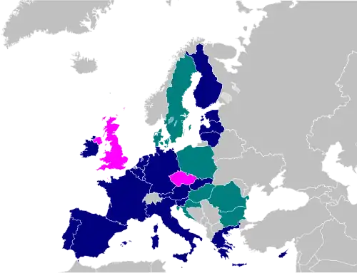 - États membres de la zone euro : 20 pays (Allemagne, Autriche, Belgique, Chypre, Croatie, Espagne, Estonie, Finlande, France, Grèce, Irlande, Italie, Lettonie, Lituanie, Luxembourg, Malte, Pays-Bas, Portugal, Slovaquie, Slovénie)