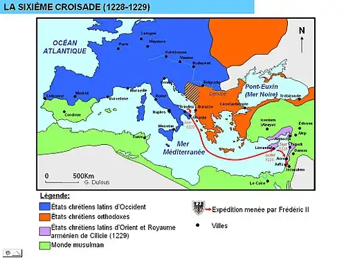 La sixième croisade, de 1228 à 1229, est une expédition organisée par l'empereur romain germanique Frédéric II pour reconquérir les territoires du royaume de Jérusalem perdus depuis la conquête par Saladin. Elle a été un demi-succès temporaire pour les croisés, mais ses objectifs sont atteints par la diplomatie d’un empereur excommunié plutôt que par les combats, au grand scandale de la chrétienté. En effet cela signifiait qu'un empereur jugé hérétique[réf. nécessaire] allait conduire la sixième croisade. Cette méthode a créé un précédent qui influence les croisades suivantes. L’intervention de Frédéric II a cependant été désastreuse pour les institutions du royaume de Jérusalem qui, se retrouvant sans roi, Frédéric abandonnant Jérusalem après trois jours, manque désormais d’un pouvoir central et se retrouve en proie à l’anarchie, les différentes factions (les barons, les ordres de chevalerie, les compagnies maritimes commerciales) ayant chacune sa propre politique sans qu’un souverain puisse arbitrer leurs querelles.