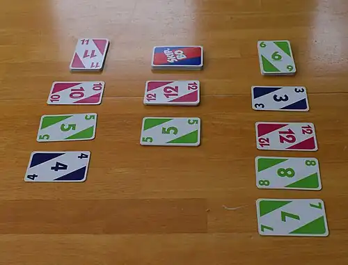 Quand l'une des piles σ atteint 12, elle est retirée de la table[4], ce qui libère de la place pour une pile à construire. Ces 12 cartes peuvent être brassées et ajoutées sous la pile ρ.