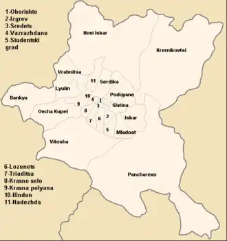 Cette oblast regroupe seulement 1 municipalité - Stolitchna obchtina (en bulgare : Столична община - Municipalité de la capitale), qui est divisée en 24 raions administratives.