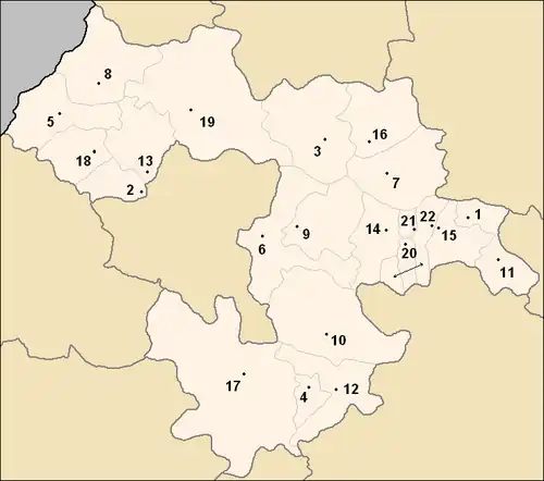 Les noms de localités en caractères gras ont le statut de ville (en bulgare : град, translittéré en grad). Les autres localités ont le statut de village (en bulgare : село translittéré en selo).