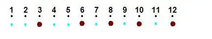 (chaque numéro représente un battement. Les carrés bleus représentent les temps faibles et les points marron les temps forts)