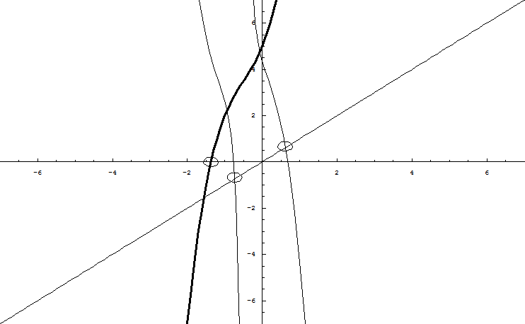 La courbe réelle y=P3(x) a au moins une intersection avec l'axe réel (éventuellement triple), elle peut en avoir 3, ou 2 (avec 1 double). Si elle n'a qu'une seule intersection réelle (simple), alors les deux intersections manquantes sont complexes (conjuguées l'une de l'autre). Lorsque la courbe réelle de y=P3(x) possède un coude et que ce coude est proche de l'axe (Ox), alors par un argument de continuité, on peut avancer que les intersections complexes sont proches de cet optimal local, mais quand la courbe ne possède pas de coude, ou que le coude est loin de l'axe (Ox), où vont les intersections complexes ?