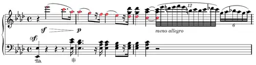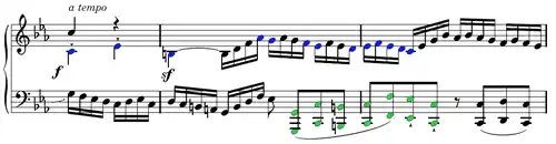 ) et en octaves dans le registre grave, répétée une fois, la première partie du thème A est composée d'une levée en triolet de doubles croches, de deux noires (tonique do, médiante mi♭) et de la sensible (si♮) valant une noire pointée. Sans cesse réitérée et transposée, cette cellule rythmique et harmonique (I-III-VII, tonique-médiante-sensible) dominera une grande partie du premier mouvement[20]. Toujours à l'octave et sans accompagnement, l'enchaînement se fait sur une septième diminuée (si♮- la♭[N 3]) et la deuxième partie est elle-même répétée, en ralentissant légèrement (poco ritenente), puis ornée et a tempo.