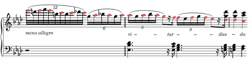 Mesure 29, après une longue gamme d'ut mineur harmonique descendante en diminuant, cette fois dans le registre aigu, le thème est repris une deuxième fois, piano, dans la même tonalité mais harmonisé, quittant le seul jeu d'octave présent depuis le début et gardant ses changements de tempos (poco ritenente et a tempo).