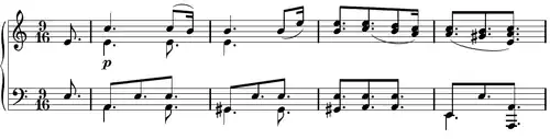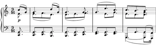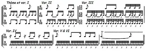 est une mesure à deux temps ternaires soit 3+3/16. - ↑ À noter que l'indication « 3 » du triolet n'est pas notée dans les éditions référencées.