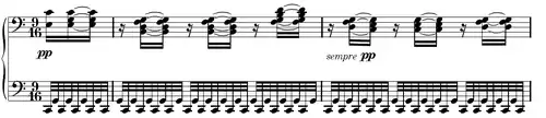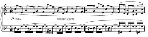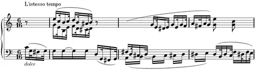 La deuxième variation conserve le tempo (L'istesso tempo) et l'esprit précédent (dolce et sempre legato), mais l'indicateur de mesure passe à ![]()