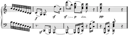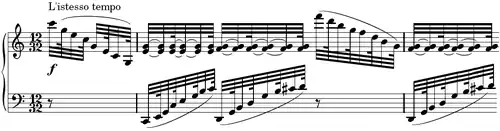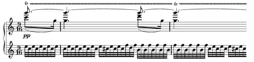 ), sur une trentième majeure (ré♭-fa). La transition sur le deuxième thème se fait… sur un accord de septième diminuée (ré♮, fa, la♭, do♭) toujours en trémolo et sur un ambitus d'une trente-quatrième diminuée ré♮-do♭ (4 octaves et une… 7e diminuée).