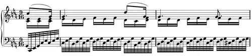 pris à la triple croche[N 7]). Les valeurs de la cellule rythmique de base sont à nouveau deux fois plus rapides que précédemment : la « double croche/triple croche en triolet » devenant « triple croche/quadruple croche en triolet ».