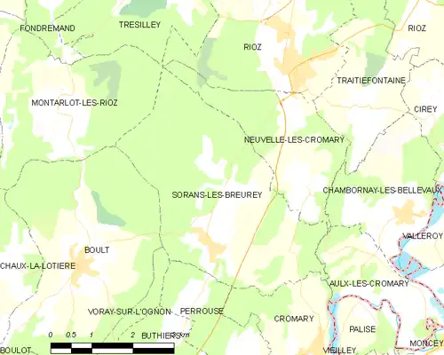 - ↑ « Orthodromie entre Sorans-lès-Breurey et Rioz », sur fr.distance.to (consulté le ).