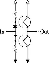 Sortie totem-pole à transistors bipolaires montés en émetteurs suiveurs. Les diodes décalent la composante continue sur les bases.