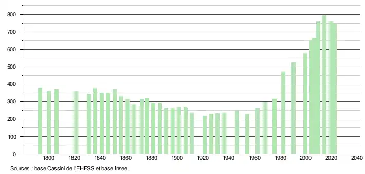 L'évolution du nombre d'habitants est connue à travers les recensements de la population effectués dans la commune depuis 1793. Pour les communes de moins de 10 000 habitants, une enquête de recensement portant sur toute la population est réalisée tous les cinq ans, les populations de référence des années intermédiaires étant quant à elles estimées par interpolation ou extrapolation[25]. Pour la commune, le premier recensement exhaustif entrant dans le cadre du nouveau dispositif a été réalisé en 2004[26].