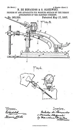 - 1 2 Brevet US 363320 "Process of and apparatus for working metals by the direct application of the electric current" (Procédé et appareil pour le travail des métaux par application directe du courant électrique), Niciiolas De Benardos et Stanislas Olszewski, 17 may 1887.