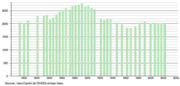 L'évolution du nombre d'habitants est connue à travers les recensements de la population effectués dans la commune depuis 1793. Pour les communes de moins de 10 000 habitants, une enquête de recensement portant sur toute la population est réalisée tous les cinq ans, les populations de référence des années intermédiaires étant quant à elles estimées par interpolation ou extrapolation[28]. Pour la commune, le premier recensement exhaustif entrant dans le cadre du nouveau dispositif a été réalisé en 2006[29].